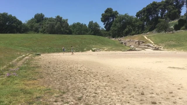 We took the bus to Olympia. A city bus. It was half an hour before we got there, but we didn't mind. We were there, the first host of the Olympic Games, OLYMPIA! Ya know, I like how when the host country has the Olympic Parade, Greece goes first, then Afghanistan, Albania, Algeria etc. When we arrived, I led us around. We first went to the Museum Of Ancient Olympia, or something like that. As always museums first, ancient things later. Out of all the museums we've visited in Greece, I liked the Olympia Museum the best, because it was the most informative, and had the most sculptures and statues leftover from ancient times. Well... maybe that wasn't the other museums fault! We then went to explore the ancient grounds, and saw a lot of columns standing, tall and proud, but no real BUILDINGS. I found it kind of boring, until we got to the running arena! One Greek 'stade' equals 178m, as we learned in Delphi. The foot race arena is one stade long. Naturally, Max and I HAD to have a race. I won, of course, but barely. Max'll be one fast little sprinter when he's older. Don't tell him I said that! I got Jay to film from the judges box, so you guys would have the best view. After the race, we all went to explore the grounds a little more, and we visited the place where the Olympic Flame is transferred onto the Olympic Torch. There was no cauldron there now, but it was worth it. Because it is the place where the Torch is lit, the Temple of Hera (Zeus' wife, goddess of marriage, peacocks and cows) has been restored marvellously. It is probably the best restored temple on the grounds, better than even then that of Zeus! After we were finished in the ruins, we walked around Olympia. At first, Max and I were a little curious as to why there were Brazilian, South Korean, Japanese and Chinese flags strung up all throughout the city. Then we realized that Rio de Janeiro hosts the 2016 Summer Olympics, and guessed that the other here countries hosted the next Olympics. I already knew that Japan hosts the 2020 Summer Olympics in Tokyo, so that helped. Later, after researching, I found that South Korea hosts the Winter Olympics of 2018, and China does the Winter Olympics of 2022. Olympia was a pretty cool town, built around the Olympics.